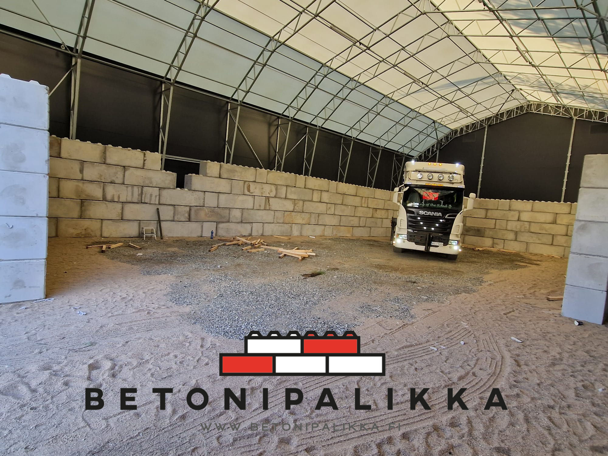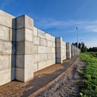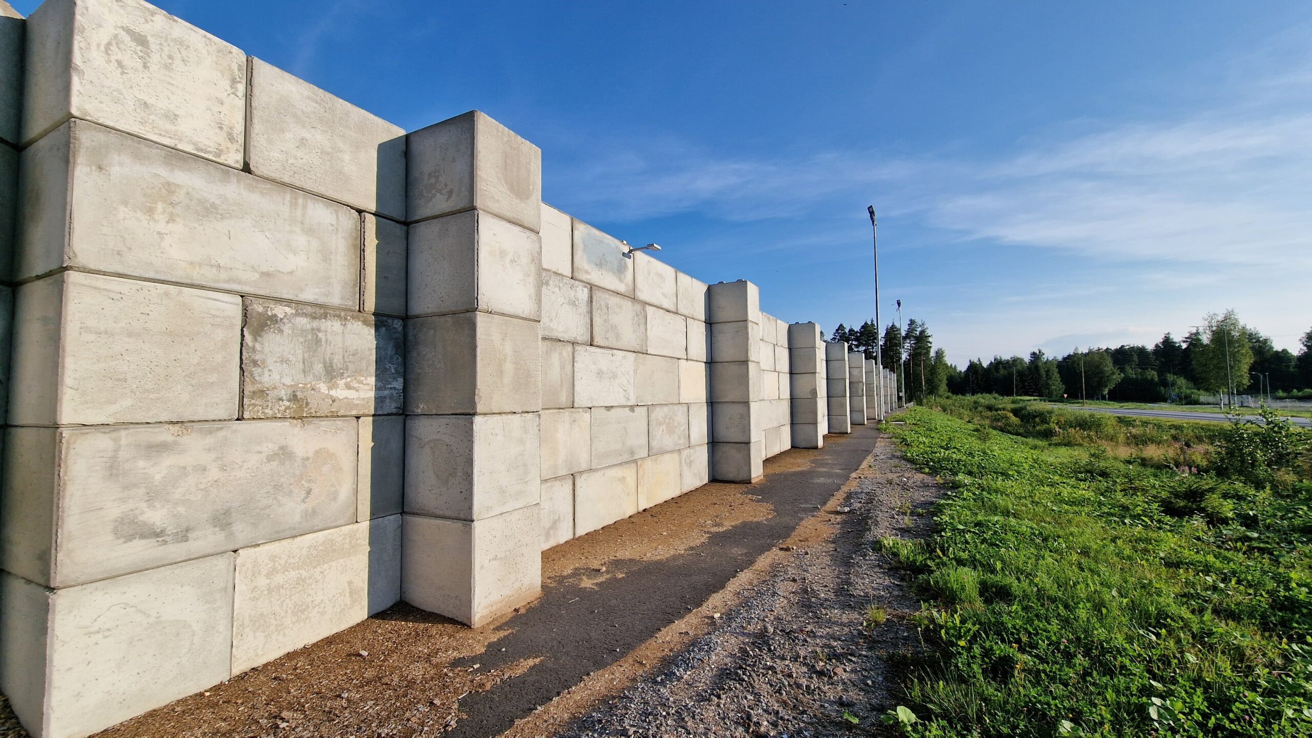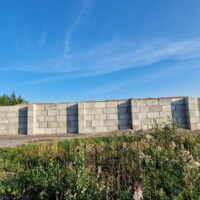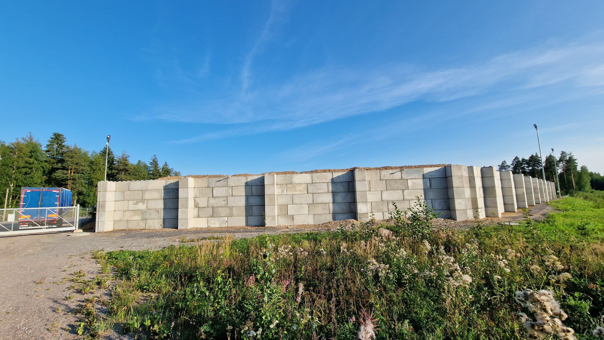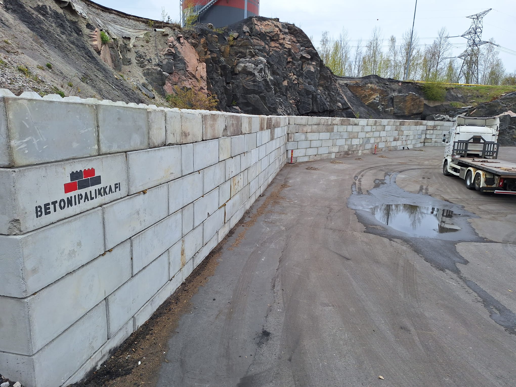 Kohteessa haluttiin estää hakkeen ajautuminen kallion juureen, jotta hakkeen kauhominen olisi helpompaa eikä hakkeen sekaan päätyisi kallioainesta. Hakekentän ja kallion väliin rakennettiin muuri käyttäen vanhempaa betonipalkkimalliamme. Muurissa käytettiin myös kappaleita, joilla saatiin yli 90° kulmia.