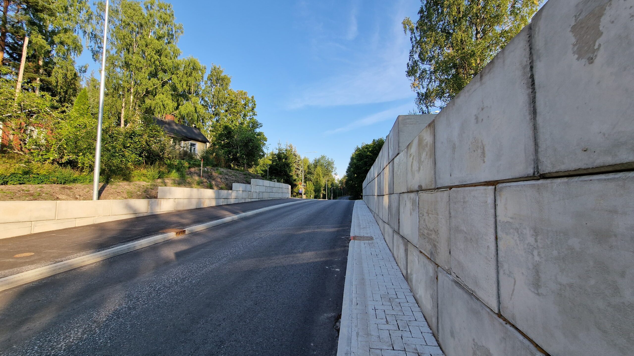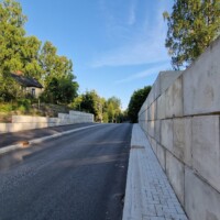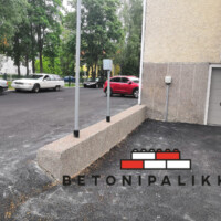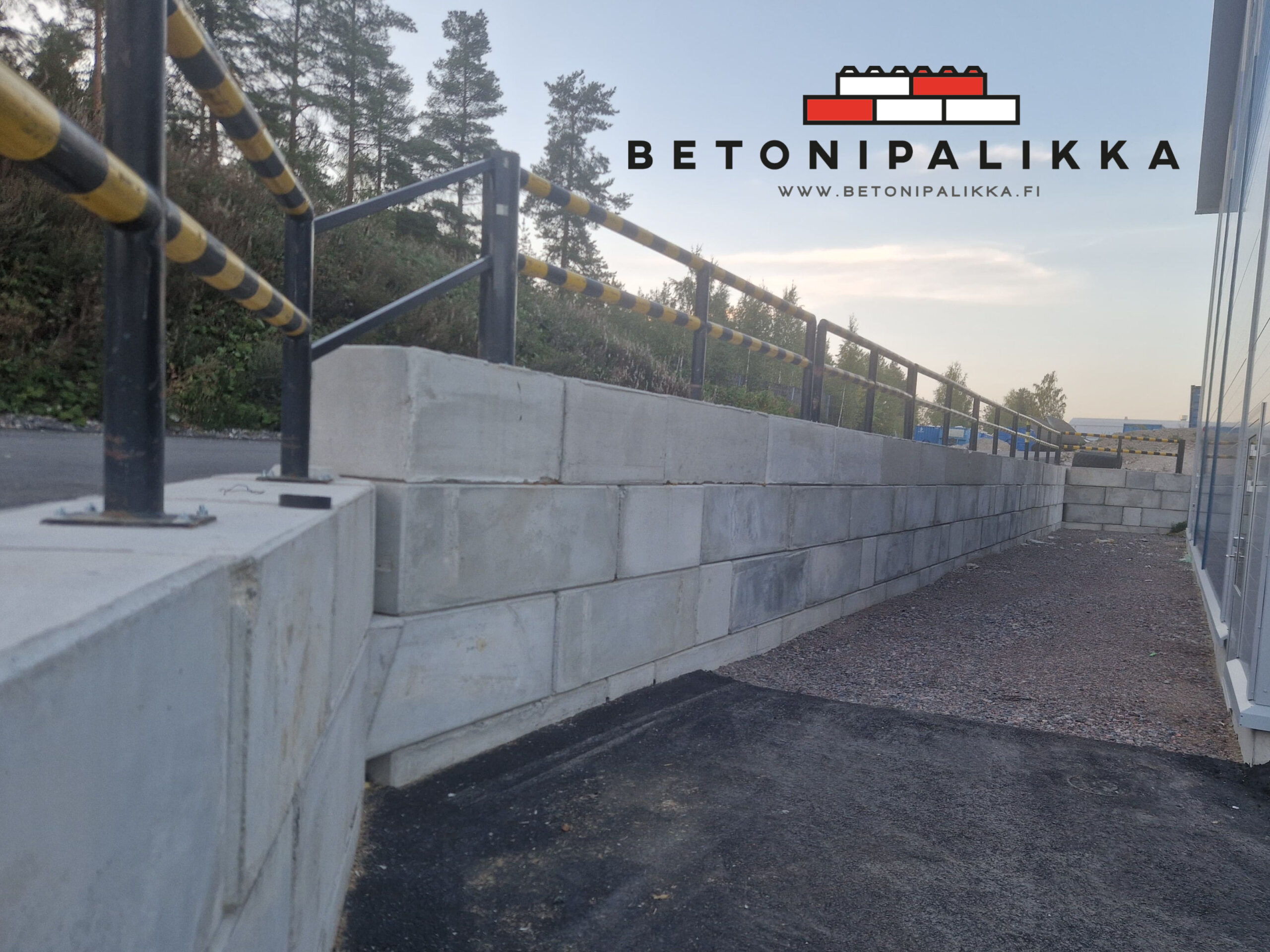 Kohteessa haluttiin rajata maanpintaa 60 cm ja liikenteen takia suojakaide päälle. Lisäksi muuri oli kaartuva. Projektissa käytettin erikoispalikoita, joita voidaan kääntää 0-50 astetta halutun kurvin aikaansaamiseksi.